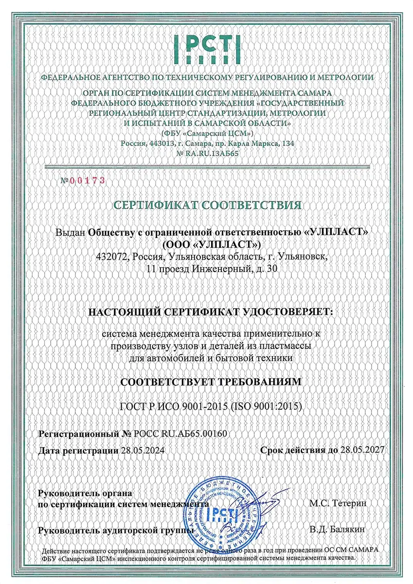 Система Менеджмента Качества нашего предприятия с 2005г сертифицирована на соответствие требованиям и стандартам ГОСТ-Р ИСО 9001:2000, и с 2018г. на соответствие требованиям и стандартам ГОСТ-Р ИСО 9001-2015. Срок действия сертификата май 2027г.